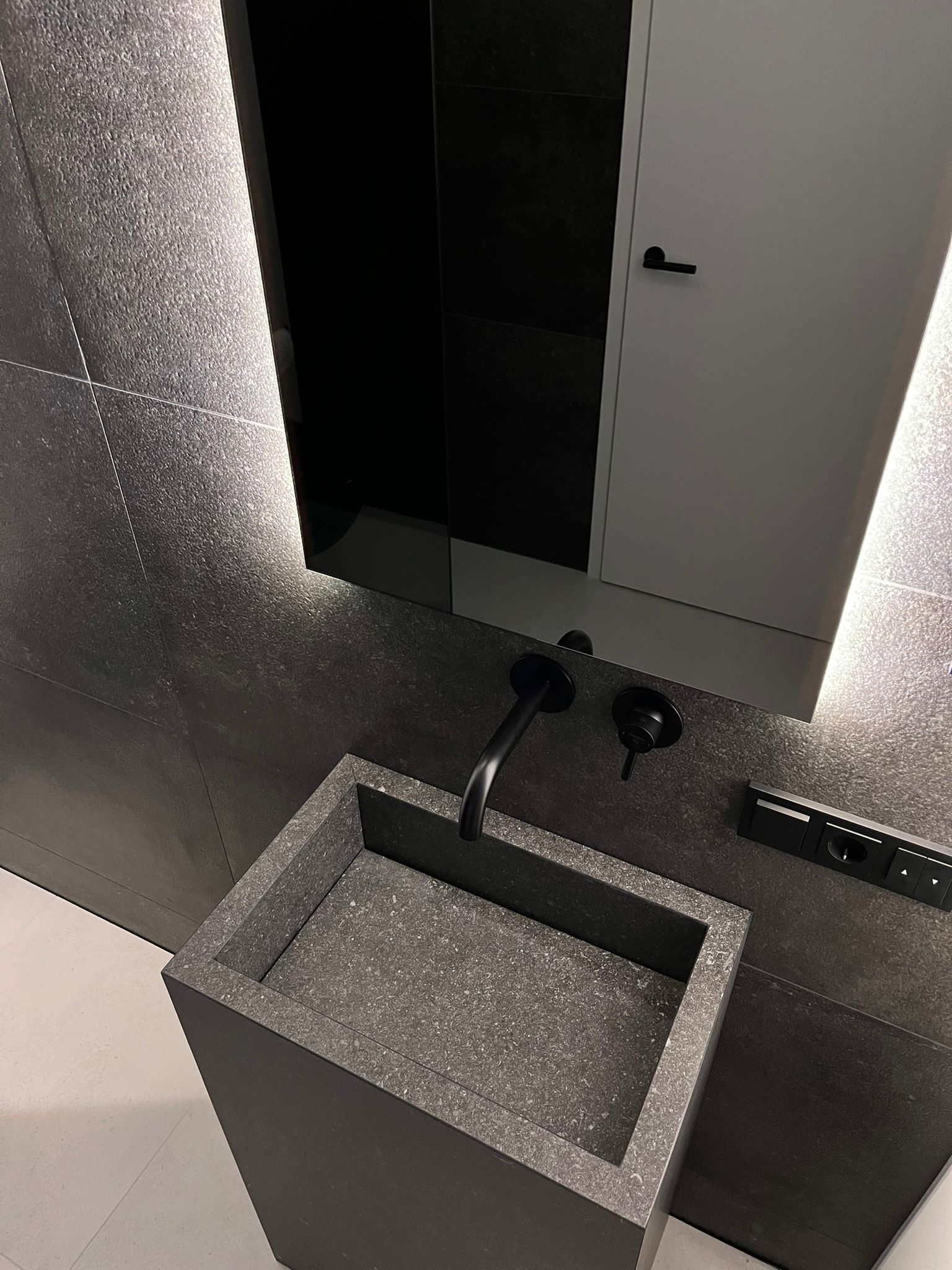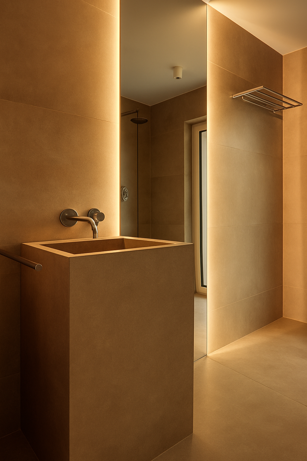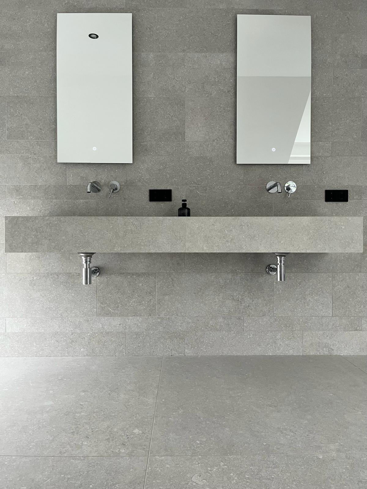 Das maßgefertigte Standwaschbecken wurde flächenbündig aus der gleichen großformatigen Fliese wie Wand und Boden gefertigt – Ton in Ton, reduziert auf das Wesentliche.