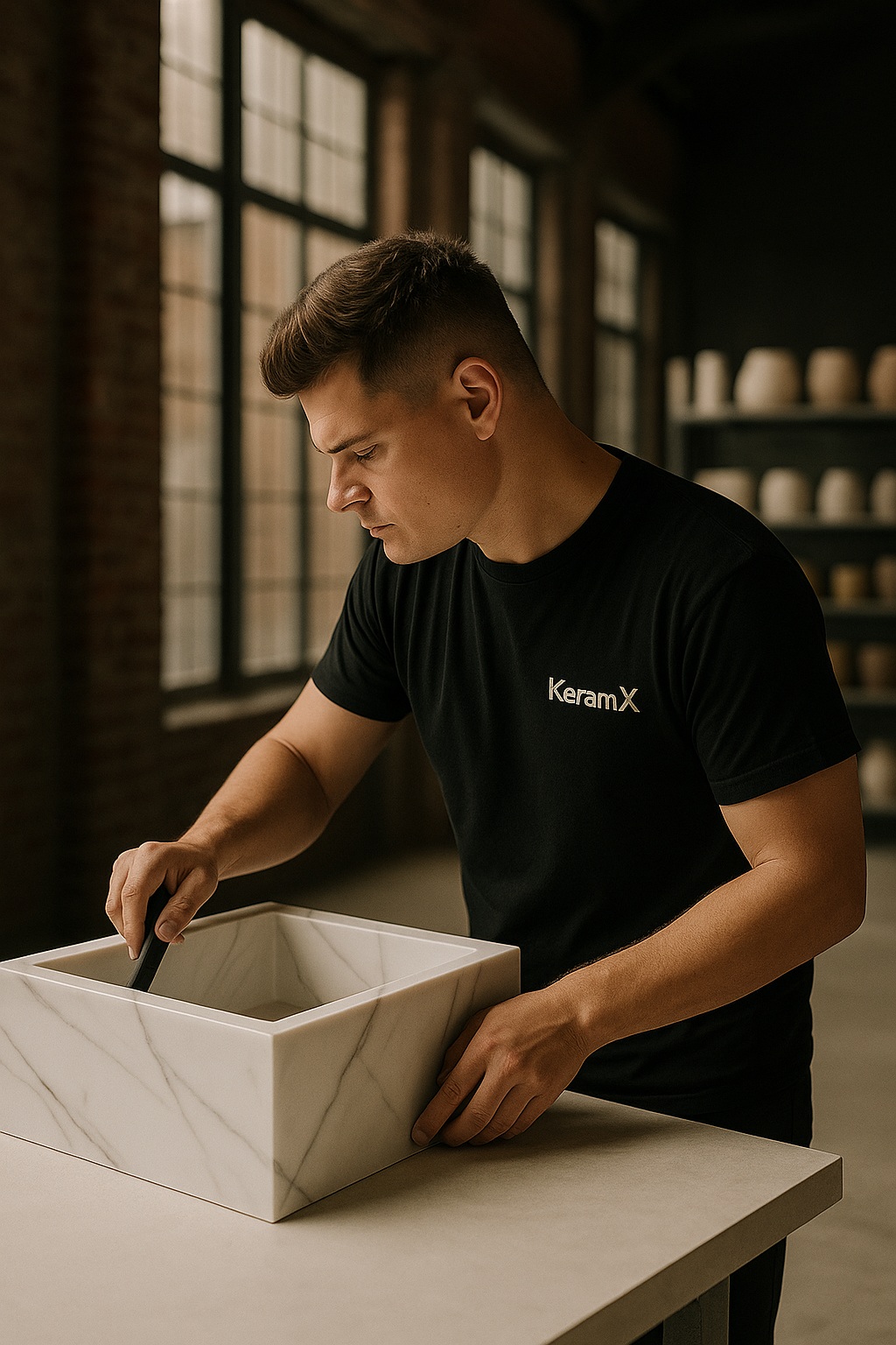 KERAMX ist das Ergebnis von Handwerkskunst, Materialbewusstsein und puristischem Design. In unserem Familienbetrieb fertigen wir hochwertige Tische und Waschtische aus Naturstein-Keramik und Eichenholz – Stück für Stück mit Liebe zur Funktion und Form.